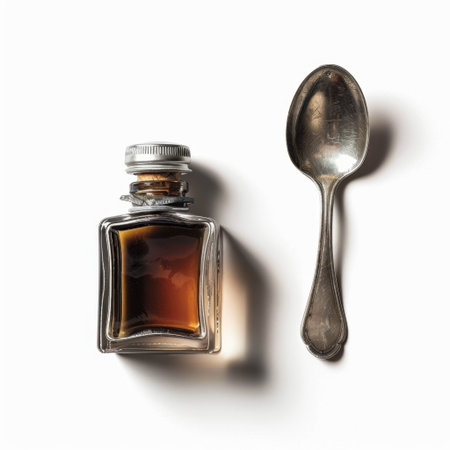 A sophisticated glass bottle filled with rich dark syrup is paired with a vintage silver spoon, creating a stylish still life perfect for culinary enthusiasts and food photography.
