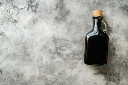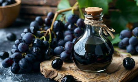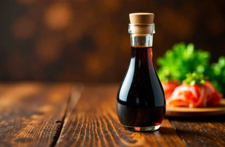 A bottle of syrup sits atop a simple wooden table, creating a classic and cozy scene, 100-year-old balsamic vinegar in an artisan glass bottle, AI Generated