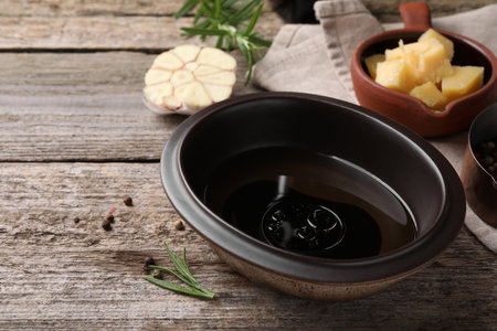 Bowl of balsamic vinegar with oil on wooden table, closeup. Space for text