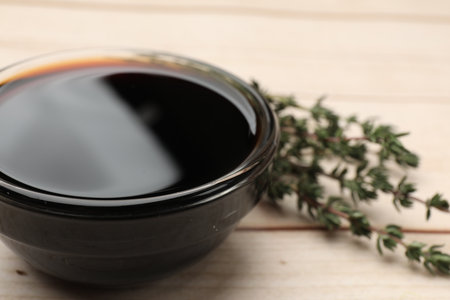 Soy sauce and thyme for marinade on wooden table, closeup. Space for text