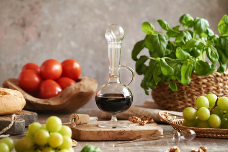 A bottle of Italian balsamic vinegar with tomatoes, ciabatta, grapes, walnuts and fresh basil