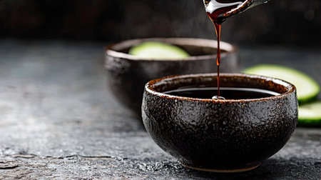 This captivating image features soy sauce cascading from a spoon into dark ceramic bowls, enhancing a culinary setting. The rustic table adds charm.