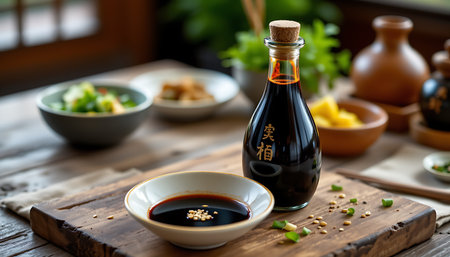 a rich depiction of korean style soy sauce, presented in an elegant ceramic bottle with intricate patterns, placed on a rustic wooden table. the dark, glossy sauce is poured into a small dish, reflecting soft light, while garnishes like sesame seeds and scallions add authenticity. the background is a blurred korean dining setting with traditional elements, evoking cultural richness and culinary tradition
