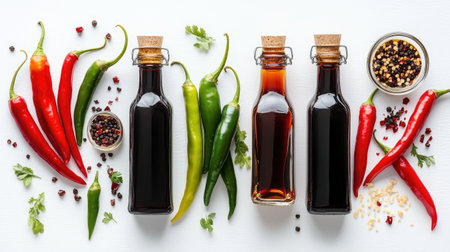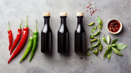 A flat lay of fresh red and green chilies alongside bottles of soy sauce, fish sauce, and vinegar, representing common ingredients in Southeast Asian cuisine.