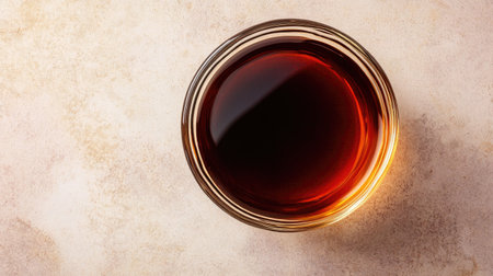 A top view of fish sauce in a round glass bowl, its warm tones standing out against a cool-toned table