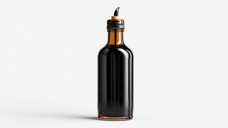Dark soy sauce in amber glass bottle with pouring spout on white background, essential Asian cooking condiment for seasoning and marinades.