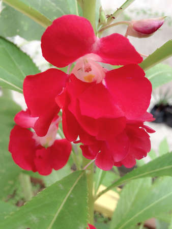 Red Balsam Flowers (Impatiens Balsamina) in the Garden. Beautiful red flowers and buds of Impatiens walleriana also known as busy Lizzie