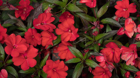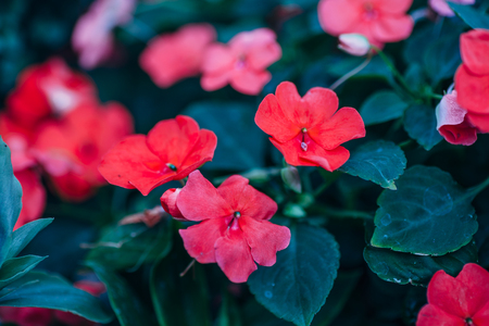 Close up of vivid red impatiens walleriana flowers in a sunny summer garden, beautiful outdoor floral background photographed with soft focus