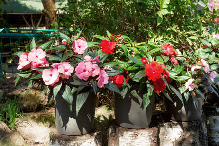 Red and pink New Guinea impatiens flowers in pots on birch chunk in summer garden, morning sun with shaddows