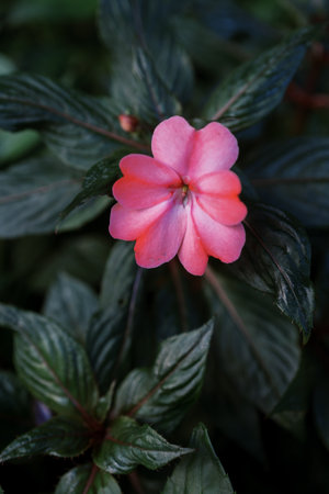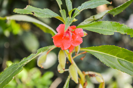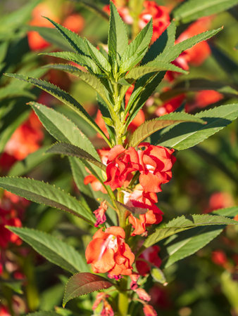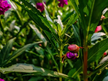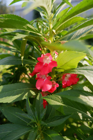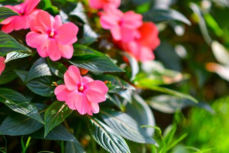 The Impatiens in summer, Bright sunlight pierces dense foliage, the air feels hot, natural color