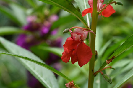 Beautiful Himalayan balsam, Impatiens glandulifera blooming flower close up photo. Policeman Helmet plant, Bobby Tops, Invasive asian plant species.