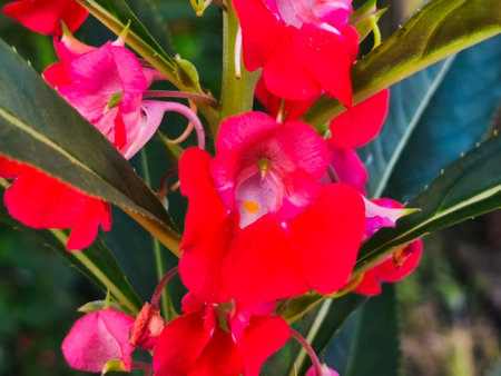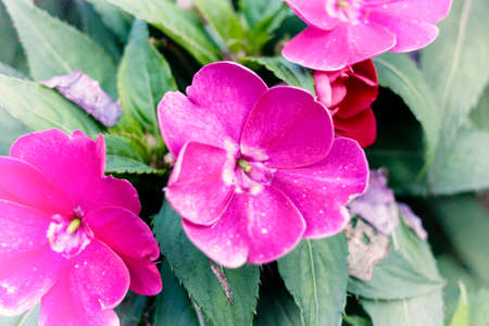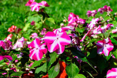 Close up of vivid pink, red and white impatiens walleriana flowers in a sunny summer garden, beautiful outdoor floral background photographed with soft focus