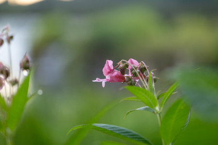Bright pink flowers of himalayan balsam plant growing near the water. Beautiful Summer scenery of Latvia, Northern Europe.