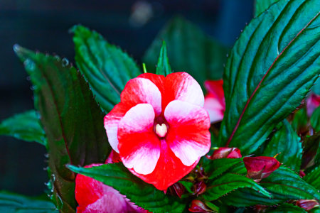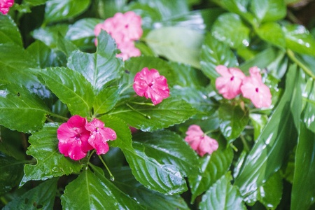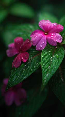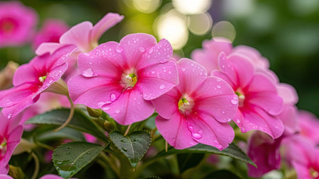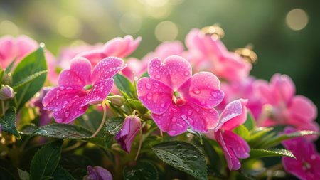 Impatiens in gentle light rain, soft raindrops visible on vivid green leaves, natural realistic style, bright fresh colors, balanced wide composition, cinematic framing, highly detailed.