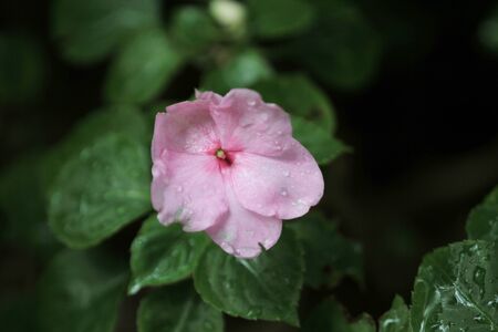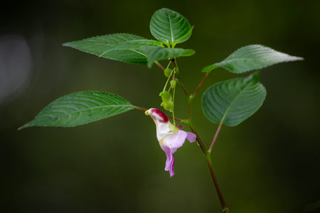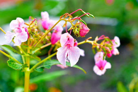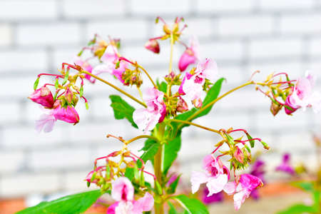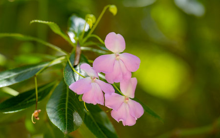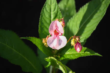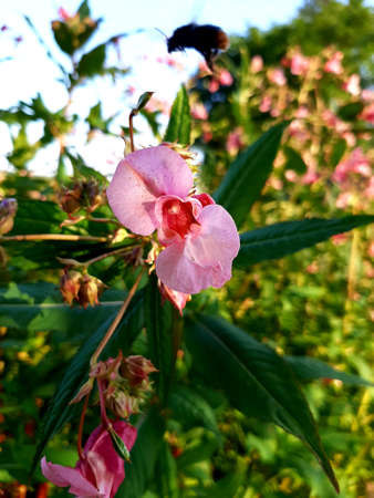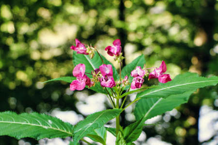 Small pink flowers of touch me not plant with leaves on sunny day in straight sunlight