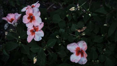 Small light pink flowers grow in the garden. Flowers close-up in a flower bed top view. Minimalistic design of a plant and gardening lover.