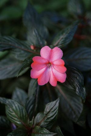 Bright pink flower stands out among dark green foliage, creating a serene scene in a peaceful garden.