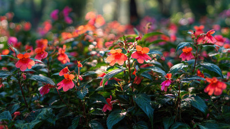 A wide shot of Impatiens swaying gently in the wind, realistic photography style, bright and vivid colors, natural lighting.