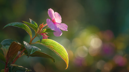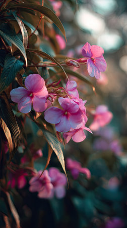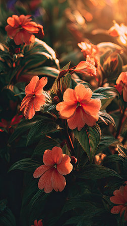 The Impatiens at sunset, Golden red sunset light filters through the leaves, still atmosphere, warm orange glow blending with natural green
