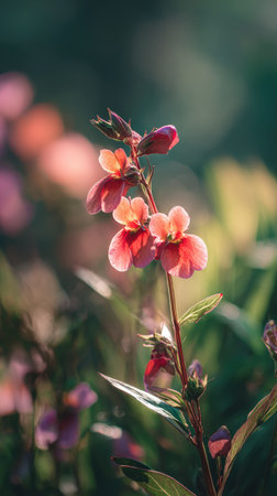 A sunlit portrait of a single Diascia, photographed outdoors on a clear, breezy day. Fresh, crisp air renders vivid detail in the leave veins glowing with gentle backlight. The background falls into a soft natural bokeh of greenery, colors truetolife, organic beauty in pure sunlight.