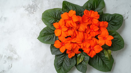 Bright orange flowers are beautifully arranged with lush green leaves on a textured background, creating a vibrant and fresh composition perfect for nature and floral enthusiasts.