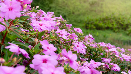 Pink flower of Busy Lizzie. Flowers densely planted on the hillside. Blurred background of green grass.