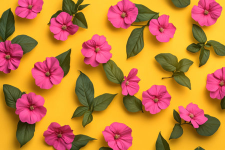 Vibrant pink flowers scattered on a bright yellow background, creating a cheerful and fresh atmosphere perfect for spring and summer decorations