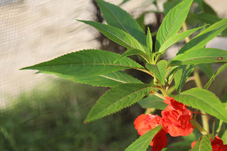 A shallow focus closeup shot of a red Balsam flower with its big green leaves with a net in the background