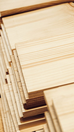 Stacked wooden carpentry boards from natural wood in a woodworking industry.