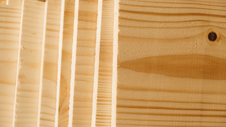 Wood texture background. Lumber industrial wood texture. End end made from machined wooden beam. Glued pine timber beams for wooden windows closeup.