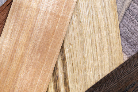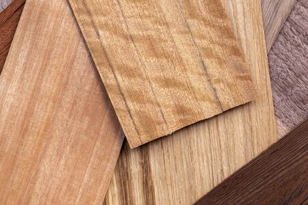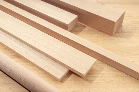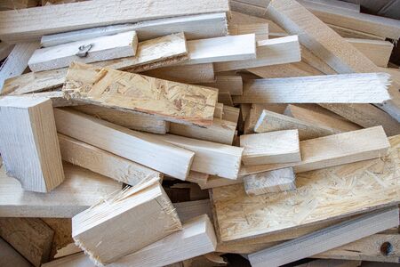 Group of assorted wood material like planks, squares, sheets. Timber for carpentry. Close up