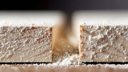 High-resolution close-up image of two pieces of wood, with sawdust scattered between them. The wood grain is visible and covered in a layer of fine white dust. The lighting highlights the texture of the wood and the sawdust.