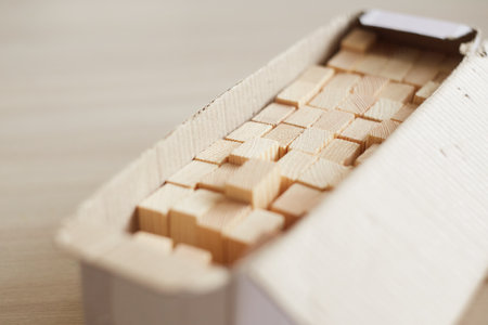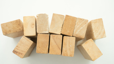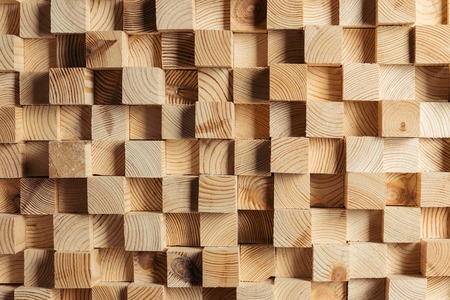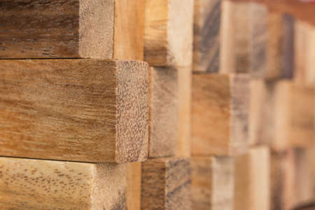 A pile of wooden blocks cut into cubes, all scattered on top of each other. Industrial background