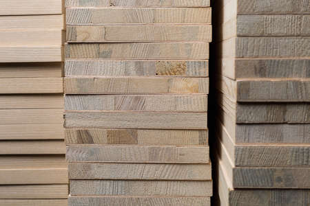 Wood timber construction material closeup for background and texture. Stack of wooden blanks at the sawmill.