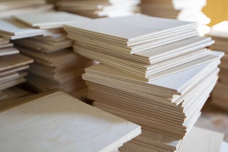 Plywood for industry and construction. Plywood parts. Plywood cuttings for use as texture or background. Plywood boards on the industry.