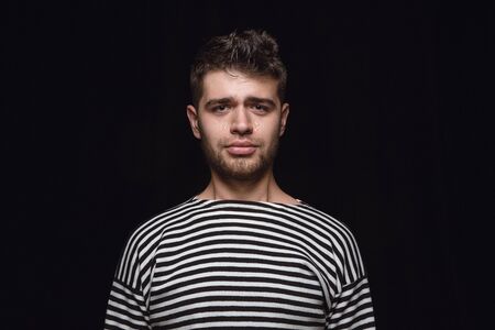 Close up portrait of young man isolated on black studio background. Photoshot of real emotions of male model. Crying, sad, dreary and hopeless. Facial expression, human emotions concept.