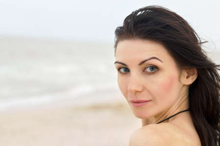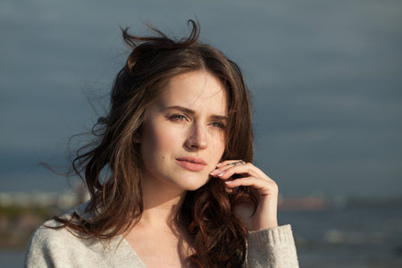 Smiling brunette woman with fresh skin, natural make-up and healthy wavy brown hair enjoying the sunny morning and sea air. Female model outdoor fashion portrait