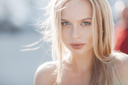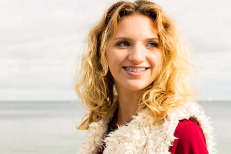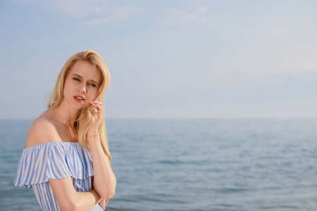 Holidays, summertime and freedom concept. Lovely blonde girl relaxing outdoor by seaside enjoying sunny windy day
