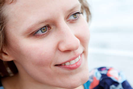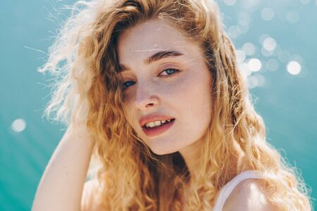 Nice girl with long red hair is standing on the background of a water surface. Portrait of a woman without retouching with her natural imperfections