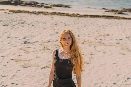Portrait of young smiling blond girl in black blouse and skirt walking in the day on the white beach near the sea, Lofoten Islands, Norway