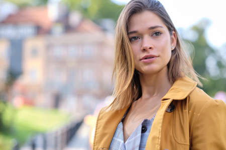 Fresh portrait sensual beautiful young woman with pretty sexy lips with tanned healthy skin in elegant stylish shirt in line on street on windy day. Attractive fashionable girl model outdoors.