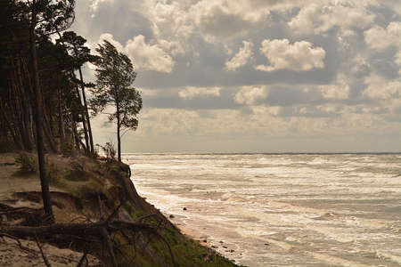 Baltic sea coast (sand dunes) and pine forest under dramatic clouds after thunderstorm. Latvia. Epic seascape. Cyclone, gale, storm, rough weather, meteorology, climate change, natural phenomenon
