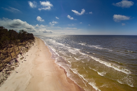 Aerial view of coast in Lithuania Baltic cold sea on a hot sunny day beach
