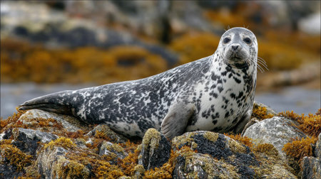 Seal basks on coastal rocks surrounded by seaweed, showing its natural behavior in the wild by the ocean during a sunny day.