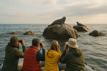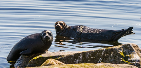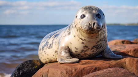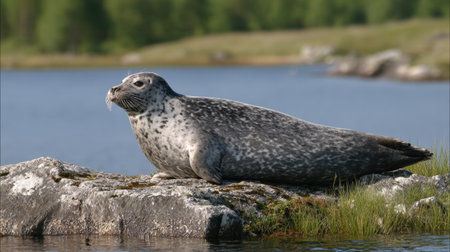 Spotted seal basking on a rock amidst a serene coastal setting.