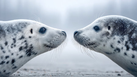 This serene image captures two seals resting on a rocky surface by the ocean, set against a misty background that enhances the tranquility of their habitat.