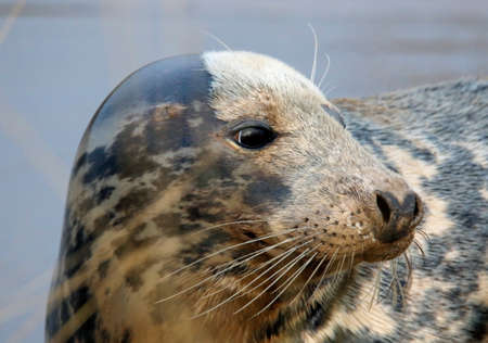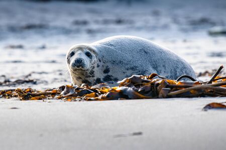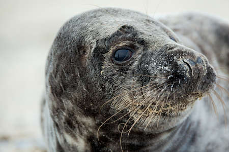 Young atlantic Grey Seal, Halichoerus grypus, detail portrait, at the beach of island Helgoland, Dune, Germany in spring