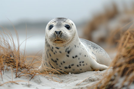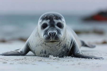Digital artwork of gray seal sitting on the beach, looking at the camera, ocean in the background, award winning wildlife photography, rule of thirds composition technique, natural lighting.