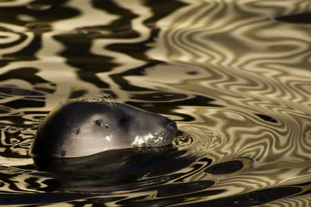 The face of a contented Baltic seal leans out of golden water, the texture of which resembles velvet. a thick sea mammal is floating at sunset.