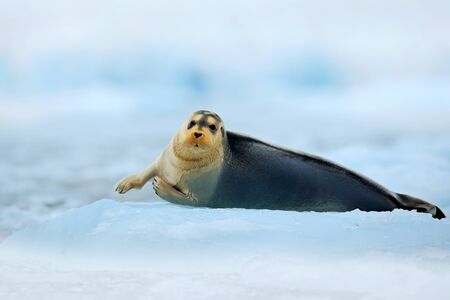 Winter scene with snow and sea animal. Bearded seal, lying sea animal on ice in Arctic Svalbard, winter cold scene with ocean, dark blurred mountain in the background, Norway. Wildlife from Europe.